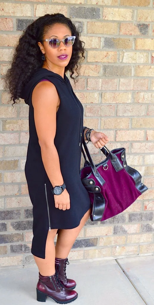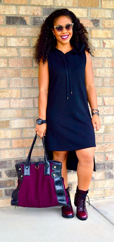 This sleeveless, hooded dress is comfy, casual and far from boring. It is detailed with a drawstring hood, a slightly high-low hem, and exposed side zippers. It feels just as comfy as your gym hoodie, but has much more style. It’s cozy, sporty and the perfect Fall transition piece.
