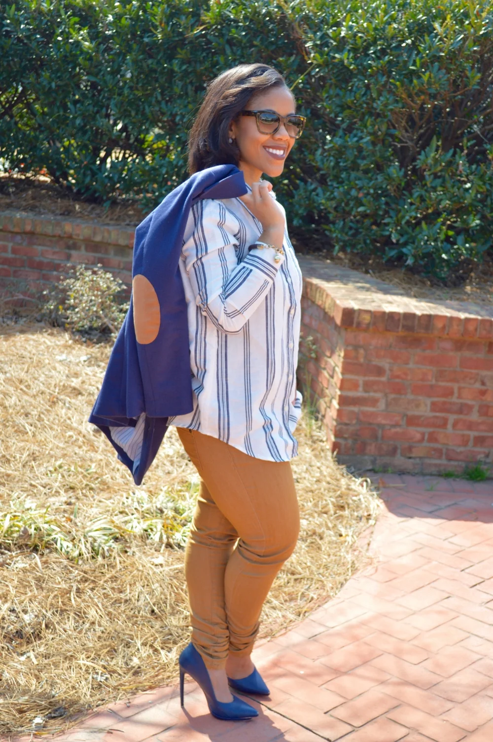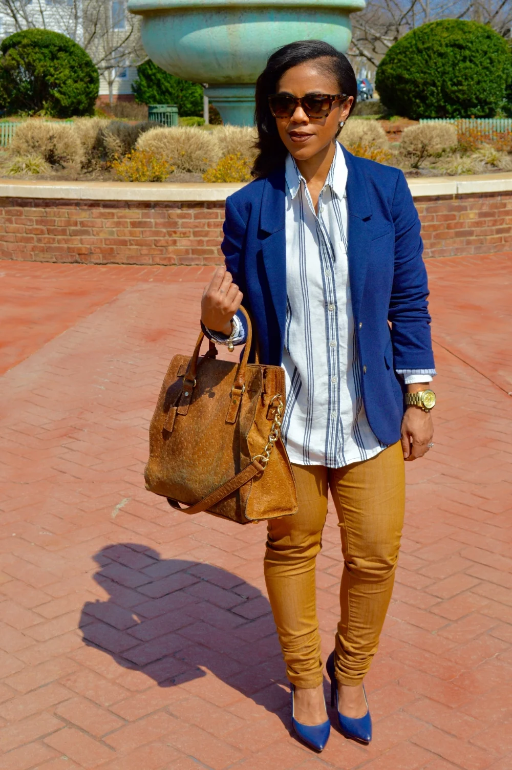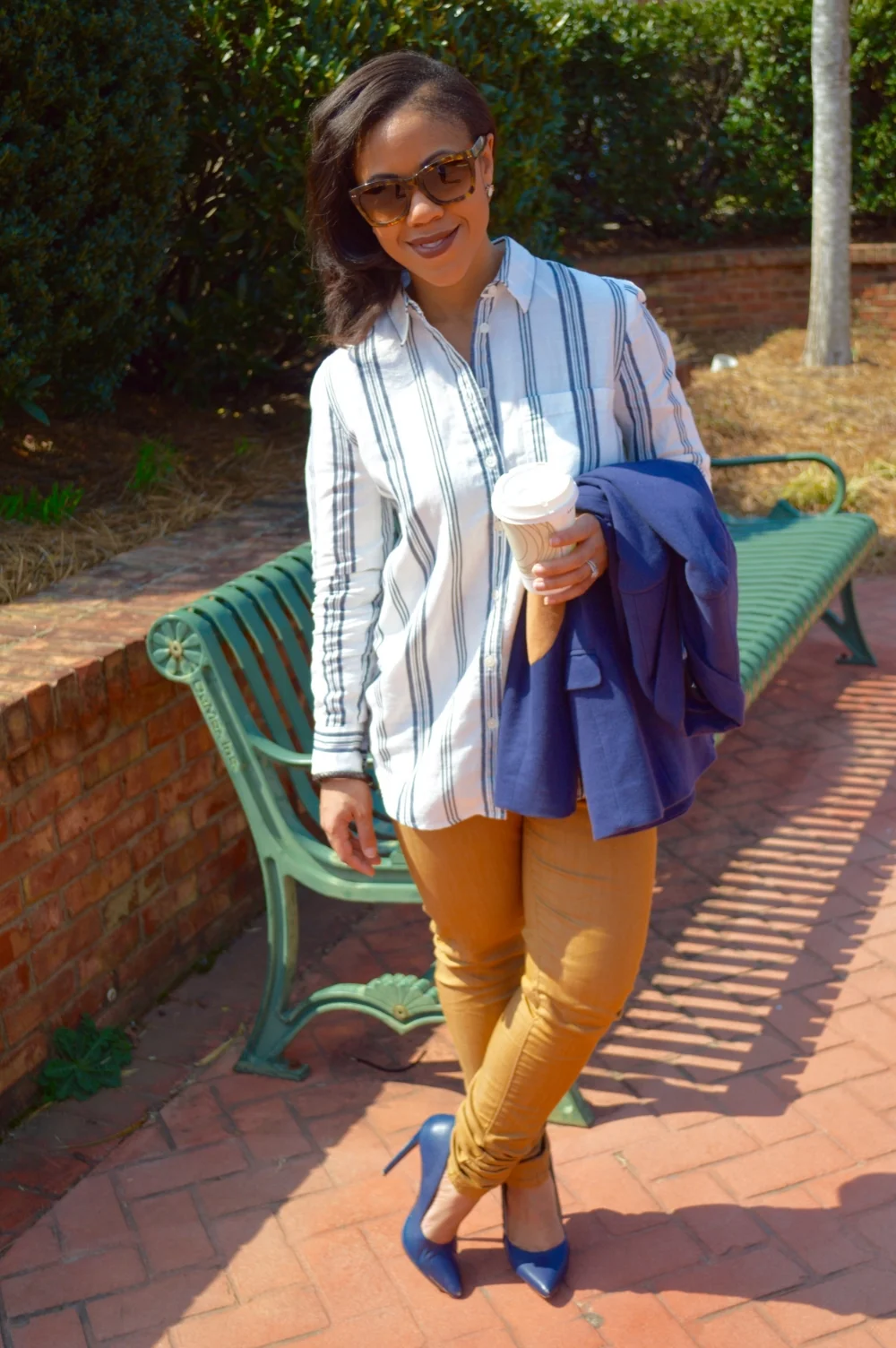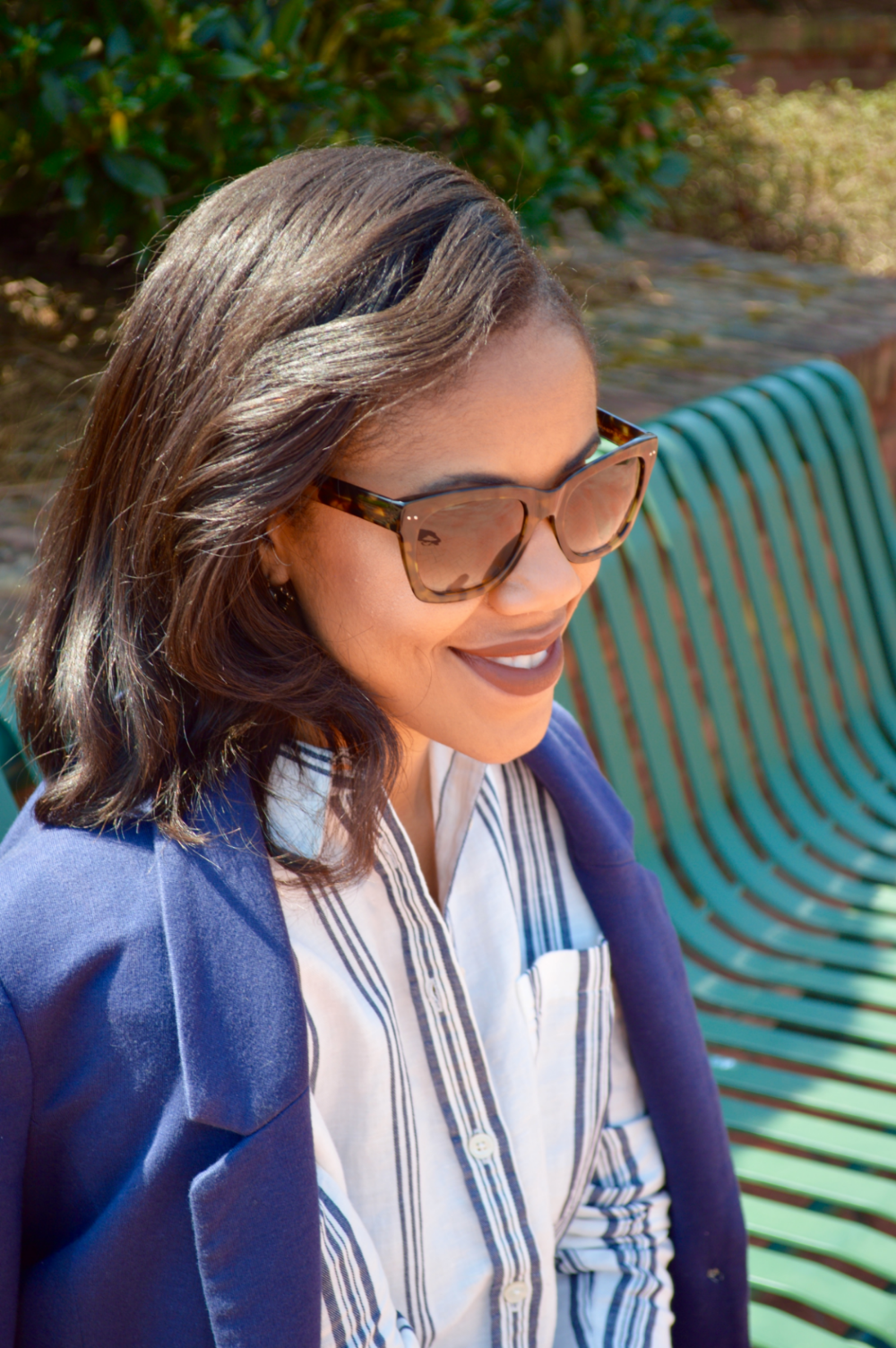 I love everything about Fridays! The weekend is near and thanks to my jobs casual Friday policy; I get to trade in my business corporate attire for something a little more comfortable. Since the term “casual” can be interpreted in many ways, I wanted to provide a little guidance on how to style corporate, casual looks. Casual Friday can mean different things to different companies, but no matter what, you should not show up to work in your flip flops. When choosing what to wear, remember that a job is a place where business is conducted, and in order to maintain your professionalism, your wardrobe should still mean business. I put together a corporate casual look by building on a classic, staple wardrobe piece; a striped button down blouse from Banana Republic. A blouse makes a casual look maintain its professionalism, and adding a blazer provides a polished finish. When I shop for professional wear, I shop the petite section for styles tailored to my body type. When it comes to jeans, I avoid wearing distressed styles or acid washes in the workplace. Don’t get me wrong, i’m all about these trends, however the office environment is not the place to show these styles off. When it comes to shoes, I usually choose comfortable pumps or ballet flats. My rule of thumb is to never wear flip-flops or sneakers in a professional environment.