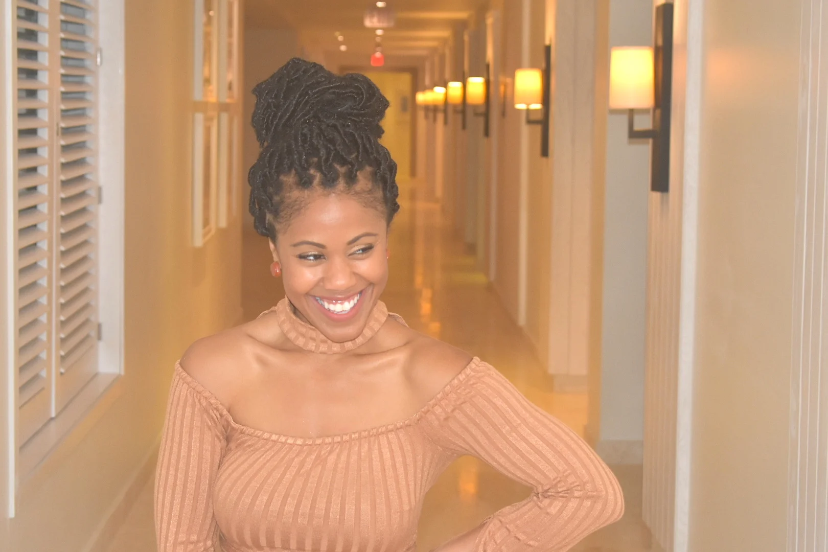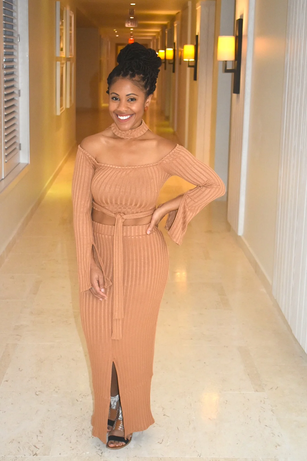 I purchased this cute two piece from Lavish Alice to wear to dinner on one of our date nights in Jamaica. I felt like a local island girl with this look, especially with my faux locs. The ribbed fabric was lightweight, soft and fitted. The belted waist tie synched my waste and slimmed my hips. The choker and dramatic sleeves completed the look with a stylish touch. This two piece would also be perfect for a NYE or Holiday party look.