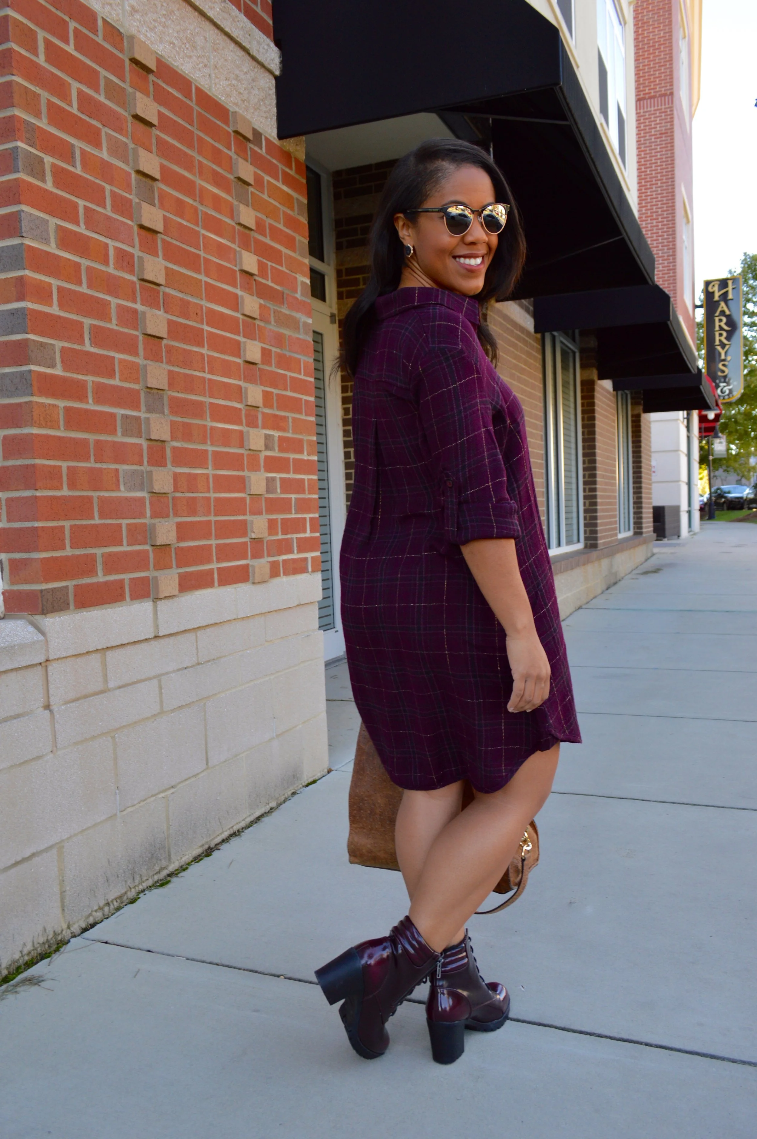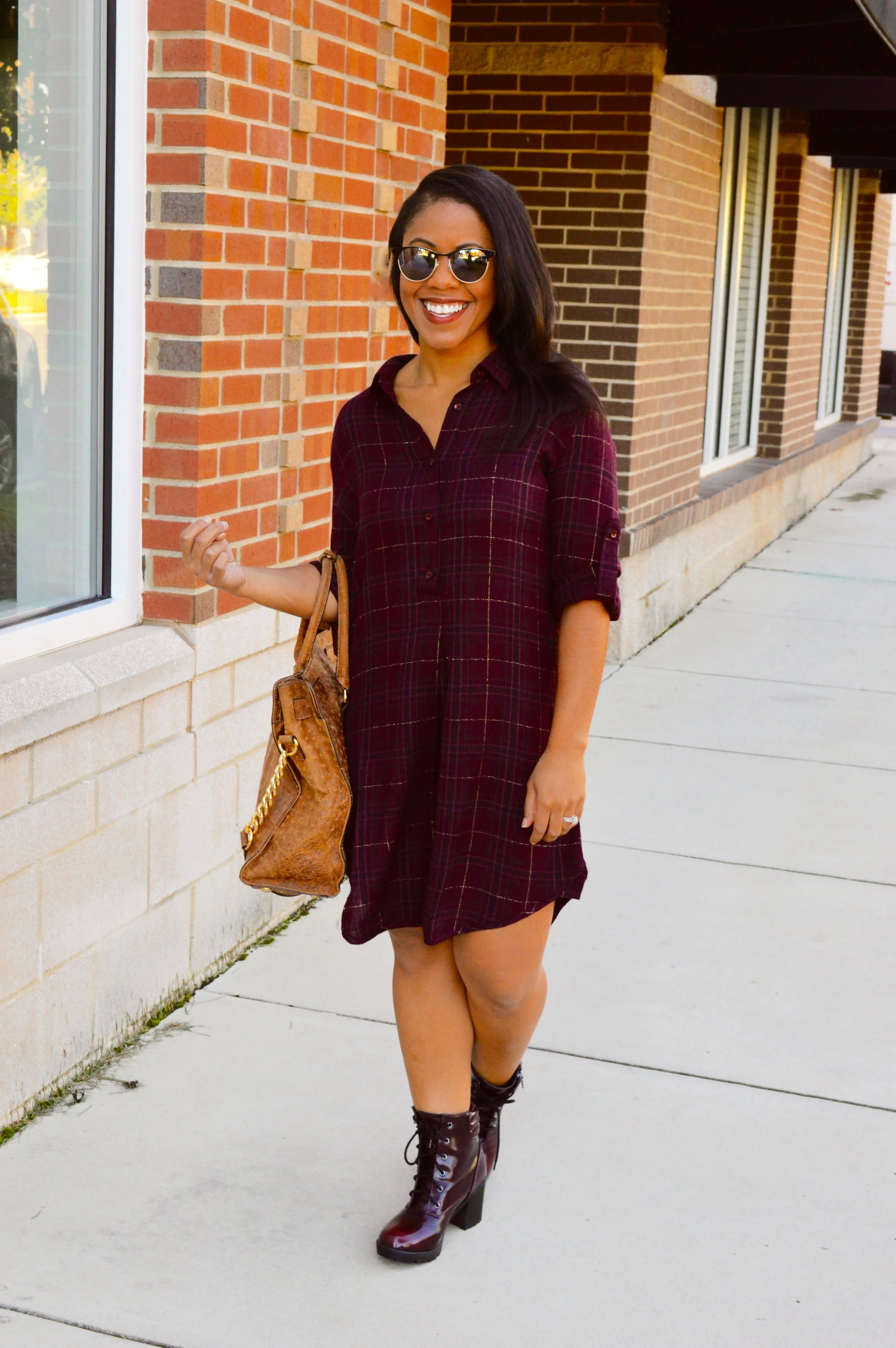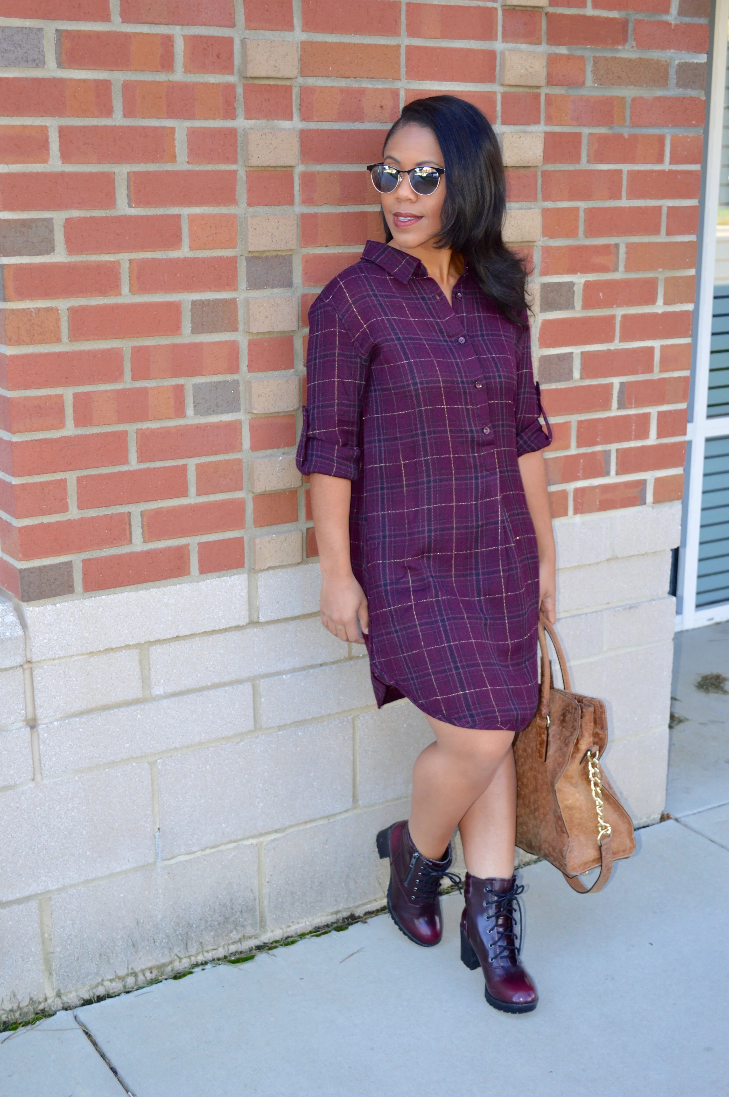 This shirtdress is a great throw on and go option for those days when you want to dress comfortably chic. The loose, drapey fabric has a flattering fit, and the burgundy check pattern is perfect for Fall. Pair it with knee high boots or ankle boots for a cute, casual look. You can even re-invent this look by wearing this over jeans or leggings for a layered versatile style.