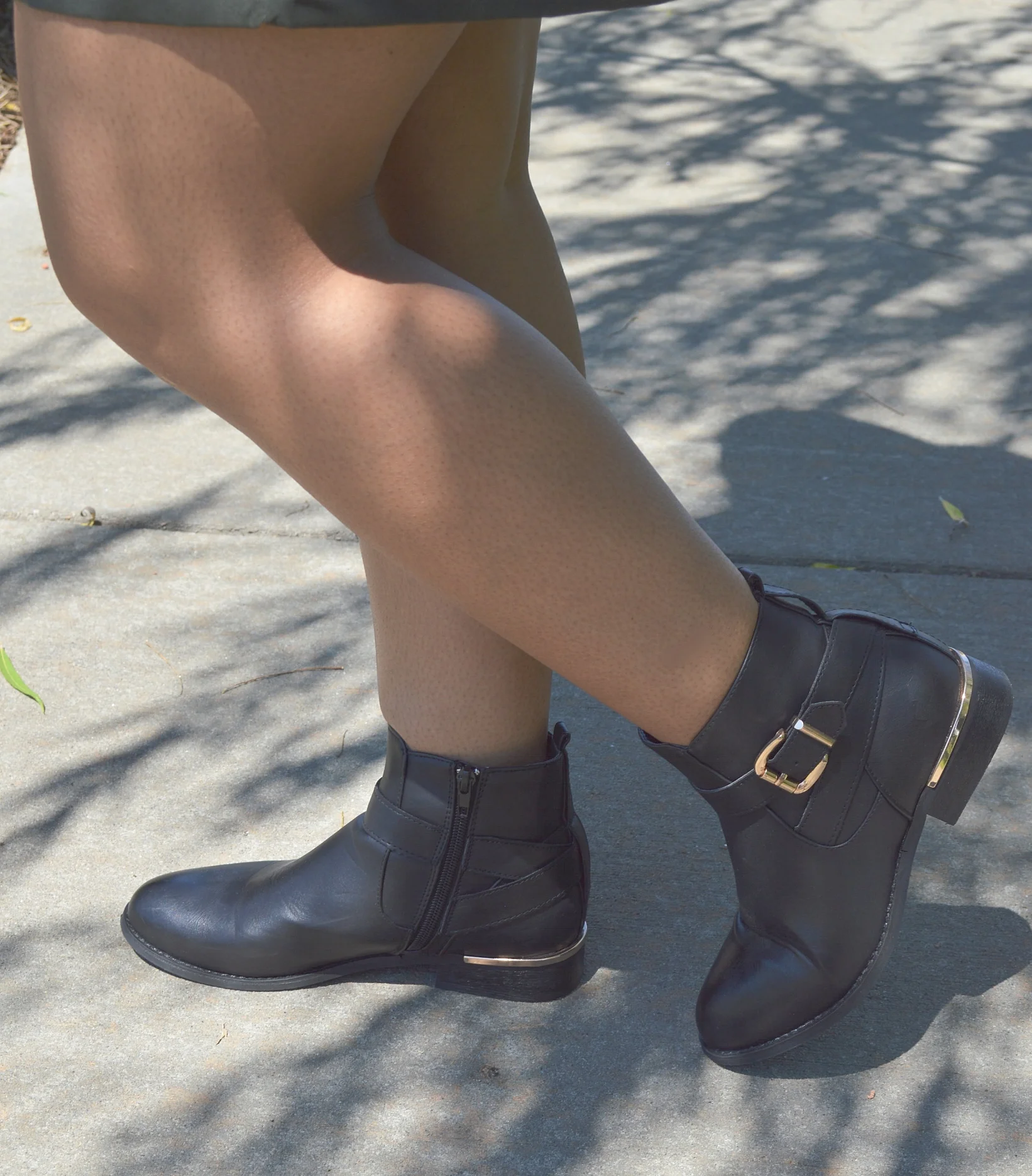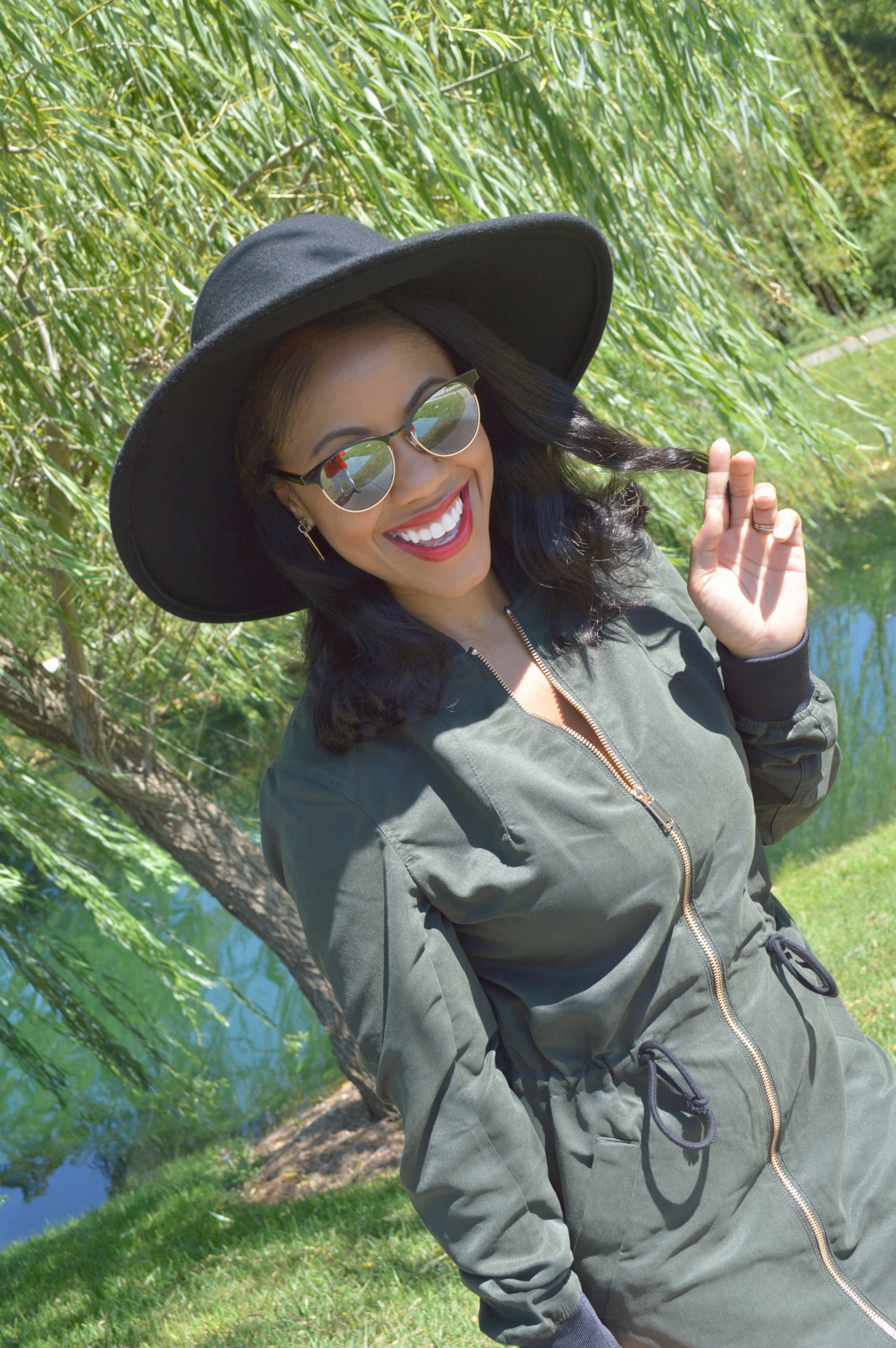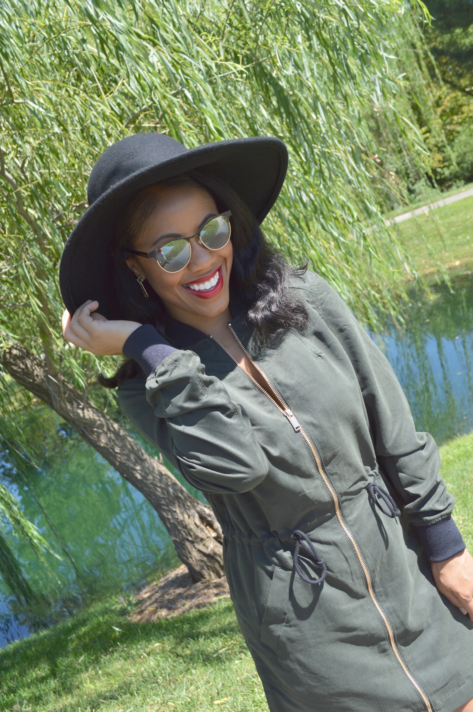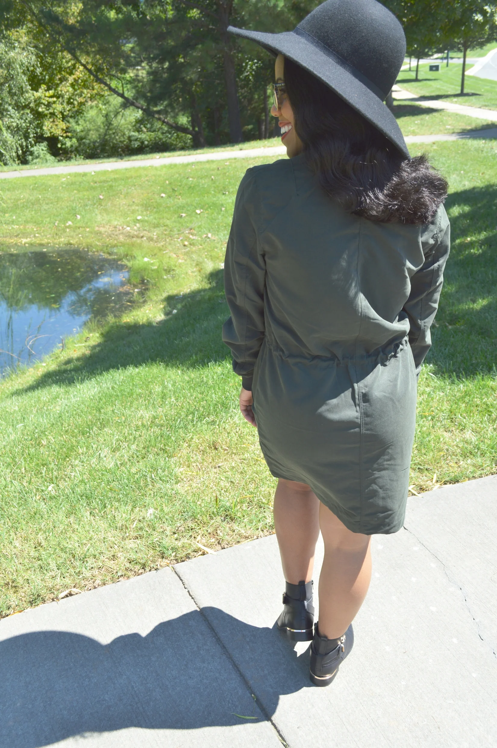 Can you believe it’s September already? Summer is drifting away from us so fast. I am all about my Summer rompers and dresses, but I also enjoy my cozy Fall layers and Pumpkin Spice Latte’s. I’m preparing to transition my wardrobe away from Summer pieces into wearing more Fall pieces, but it’s is such a challenge because the weather is still very hot in Charlotte. I just purchased this cute, long, pilot jacket from H&M, and since its just too hot to wear it as a jacket layered over a top and pants, my husband suggested that I try to wear my new jacket as a dress, and it totally worked! I guess that’s one perk to being short, you can get away with wearing jackets as dresses sometimes if the length is appropriate. It was also too hot to wear full length boots, so I pulled out my ankle booties to pair with my brim hat to complete my Fall transitional look.